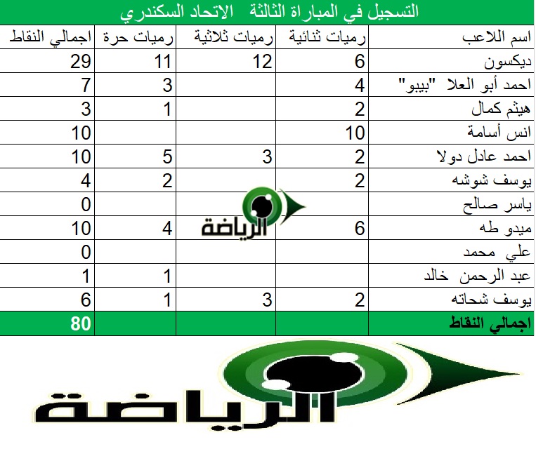 - وياتي بعدهم برصيد 7 نقاط احمد أبو العلا ” بيبيو ” برميتين ثنائية و4 رميات حرة