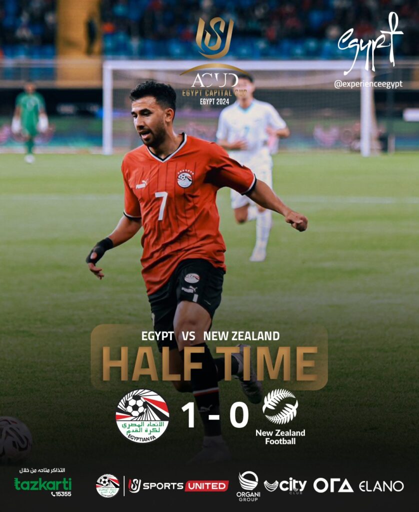 ولكن في الدقيقة 25 هجمة لمنتخب مصر من جملة فنية رائعة وانفراد لامام عاشور وتدخل قوي من مدافع نيوزيلاندا ويتم استبداله بحمدي فتحي ويحتسب الحكم ضربة جزاء لمنتخب مصر ويتقدم مصطفى محمد وينجح في تسجيل الهدف الأول لمصر في الدقيقة 29 وبعدها محاولات على استحياء من منتخب نيوزيلاندا وكانت هجمات المنتخب المصري تشكل خطورة وجملة فنية من افشه لمحمد حمدي لتريزيجيه يسدد تمر بجوار القائم الايسر لنيوزيلاندا وينتهي الشوط الأول بتقدم الفراعنة بهدف دون رد
