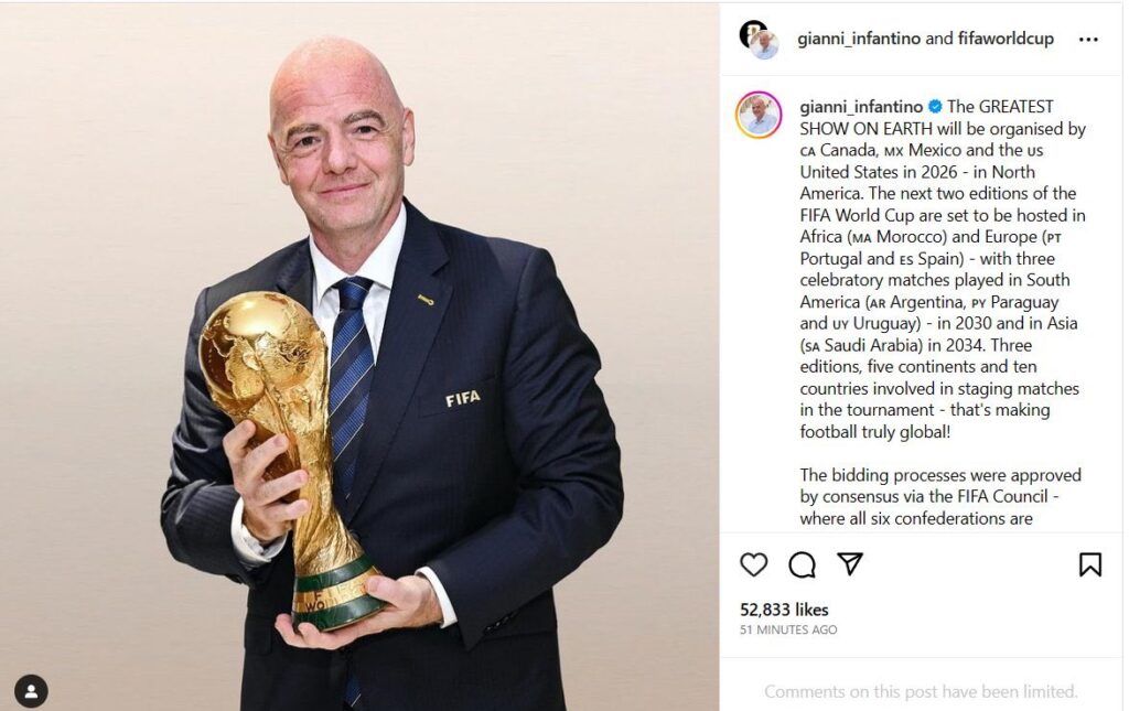 المملكة العربية السعودية بشرف استضافة نسخة 2034 من كأس_العالم بعد انتهاء مهلة الترشيحات وفازت السعودية بالاستضافة بعد انسحاب منافستها الوحيدة في القارة الآسيوية أستراليا، وذكر إينفانتينو في منشور على أنستغرام أن مجلس الفيفا وافق على منح السعودية حق استضافة البطولة بعد مشاورات مكثفة مع جميع أعضاءه.