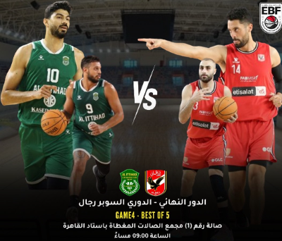 يسعد موقعنا  ” عيون الرياضة  ”  ببث مباشر للمباراة الرابعة    من ” BEST OF 5 ”   من دوري سوبر السلة المصري والتي ستقام في تمام الساعة التاسعة مساءا بصالة  استاد القاهرة والتي تجمع قطبي كرة السلة المصرية حاليا الاتحاد السكندري والنادي الأهلي وجدير بالذكر ان المباراة الأولى إنتهت  بنتيجة 71-69 لصالح الاتحاد  وإنتهت المباراة الثانية لصالح الأهلي بنتيجة   83 – 79 والمباراة الثالثة إنتهت لصالح الاتحاد السكندري بنتيجة 80 -78 لتصبح نتيجة اللقاء لصالح زعيم الثغر 2-1 وفي حالة فوزه اليوم يتوج ببطولة دوري سوبر السلة best of 5    اما  في حالة فوز الأهلي ستكون المباراة الفاصلة الخامسة غدا الجمعة