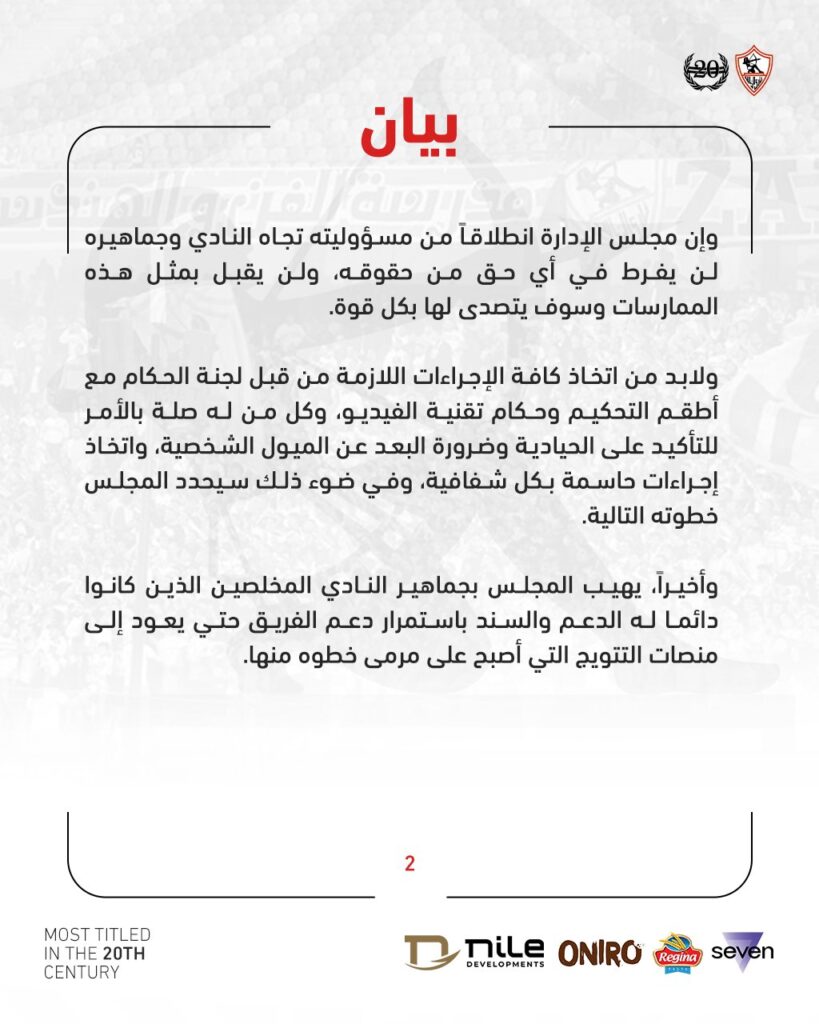 ولابد من اتخاذ كافة الإجراءات اللازمة من قبل لجنة الحكام مع أطقم التحكيم وحكام تقنية الفيديو، وكل من له صلة بالأمر للتأكيد على الحيادية وضرورة البعد عن الميول الشخصية، واتخاذ إجراءات حاسمة بكل شفافية، وفي ضوء ذلك سيحدد المجلس خطوته التالية.وأخيراً، يهيب المجلس بجماهير النادي المخلصين الذين كانوا دائما له الدعم والسند باستمرار دعم الفريق حتي يعود إلى منصات التتويج التي أصبح على مرمى خطوه منها