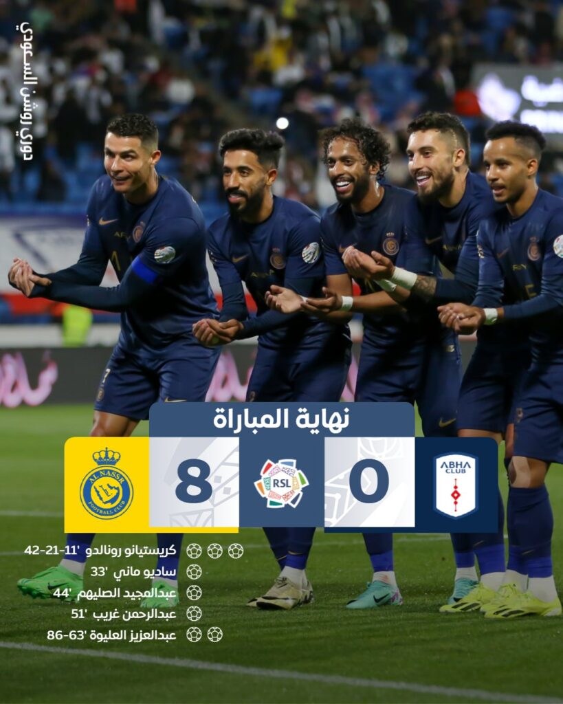 حقق فريق النصر فوزًا عريضًا على نظيره أبها، بثمانية أهداف مقابل لا شيء، في المباراة التي انطلقت بينهما، اليوم الثلاثاء، على ملعب ستاد مدينة الأمير سلطان بن عبدالعزيز الرياضية “المحالة”