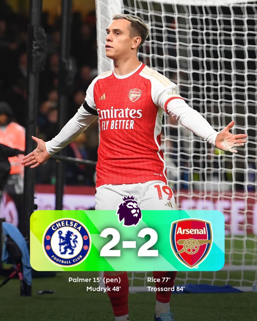 ,حتى نجح مودريك الأوكراني نجم البلوز فى إضافة الهدف الثانى بعد أن لعب عرضية ساقطة خلف رامز دين حارس ارسنال داخل المرمى مضيفا الهدف الثانى و معمقا جراح المدفعجية ,و ظل تشيلسى مسيطرا على المباراة تماما و اصبح جليا أنه فى طريقه للفوز و إلحاق اول هزيمة بارسنال و لكن فى الدقيقة ٧٧ و من خطأ لحارس تشيلسي سانشيز حيث مرر الكرة ضعيفة يخطفها ديكلان رايس بتسديدة من كرة واحدة فى المرمى الخالي قبل عودة الحارس ليشتعل اللقاء و يضغط ارسنال بكل خطوطه و يستميت مدافعوا تشيلسى فى الحفاظ على النتيجة حتى يرفع اوديجارد عرضية متقنة على القائم البعيد يخطفها البلجيكى تروسارد داخل مرمى تشيلسى مسجلا تعادلا غاليا للجانرز ٢-٢ يتشاركون به القمة مع السيتى برصيد ٢١ نقطة لكل منهم .