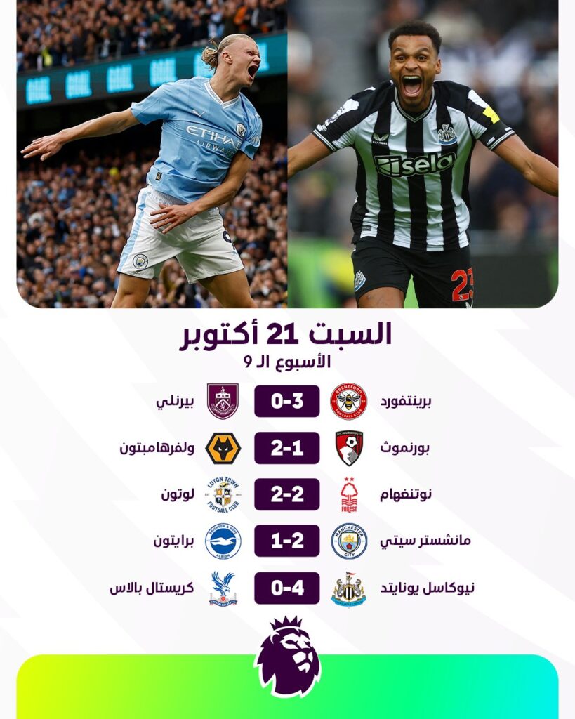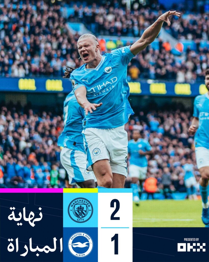 على ملعب الاتحاد بمدينة مانشستر نجح السيتيزنس فى تحقيق فوز عزيز و غالى على برايتون العنيد بعد أن تعثر الفريق فى اخر اسبوعين ,نجح السيتى فى خطف هدفين فى أول ٢٠ دقيقة عن طريق الأرجنتيني الفاريز فى الدقيقة ٧ ثم أضاف القاطرة التهديفية هالاند الهدف الثانى فى الدقيقة ١٩ و سيطر السيتى على المباراة تماما و ظهر برايتون متواضعا و بعيدا عن مستواه حتى فاجىء انزو فاتى الجميع بإحراز هدف تقليص الفارق و حاول بعد الهدف برايتون تقليص الفارق و لكن دون جدوى ليفوز السيتى ٢-١ .