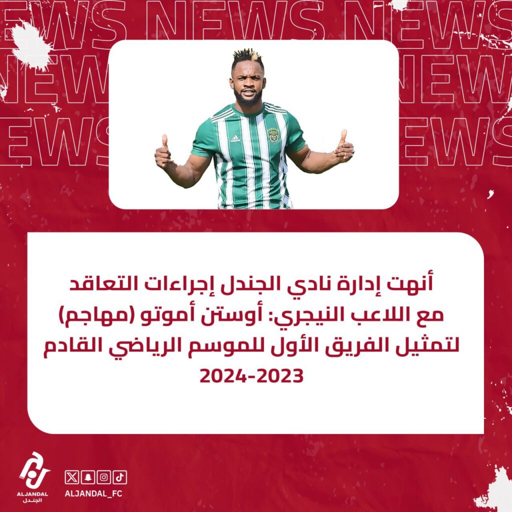 اعلن الموقع الرسمي لنادي الجندل السعودي والذي يلعب بدوري يلو السعودي انضمام اوستن اموتو على سبيل الإعارة لمدة موسم 2023 – 2024