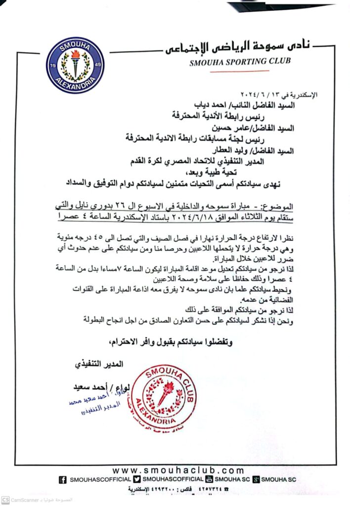 ارسل المدير التنفيذي لنادي سموحة اللواء احمد سعيد خطابا رسميا لرئيس رابطة الأندية المحترفة احمد دياب ورئيس لجنة المسابقات عامر يطلب منهما بتاجيل موعد مباراة الفريق الأول لنادي سموحة امام الداخلية بالجولة 26 من دوري “نايل ” والمقرر لها يوم الثلاثاء الموافق 18-6 القادم بإستاد الإسكندرية من الساعة الرابعة على ان يبدأ اللقاء ويتم تعديل موعده للساعة السابعة مساءا نظرا لحرارة الجو المرتفعة والتي تصل ل 45 درجة للحفاظ على اللاعبين