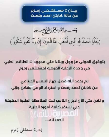 أعلنت إدارة مستشفى زمزم المعالج للاعب احمد رفعت ، اليوم الثلاثاء، إن الأطباء فصلوا أحمد رفعت لاعب الفريق عن أجهزة التنفس الصناعي وأن صانع الألعاب استرد وعيه جزئيا.وجدير بالذكر أن الجماهير السكندرية قد أصيبت بالرعب بعد سقوط رفعت بالدقيقة 88 في منتصف الملعب خلال مباراة فيوتشر والاتحاد السكندري بالدوري المصري الأسبوع الماضي دون تدخل من أي لاعب لتتوقف المباراة قبل أن يغادر ملعب الإسكندرية في سيارة إسعاف
