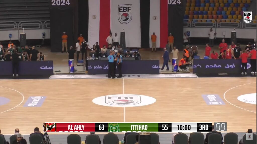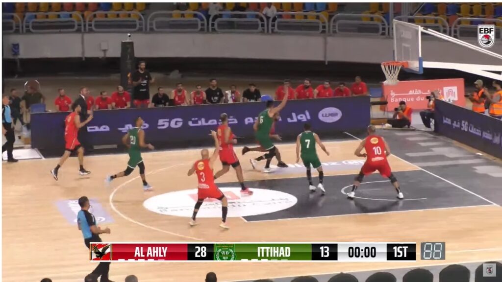 بداية للأهلي قوية ويتقدم بنتيجة 4 -2 ثم يتألق عمر الجندي بثلاثية ويزيد الفارق براندو ويسجل 6 نقاط متتالية ليتقدم الأهلي بنتيجة 18 -8 ويتقدم الأهلي 20-8 وسطاخفاقات للاعبي الاتحاد في التسديد حتى من الرميات الحرة وسط تالق للأهلي في الثلاثيات ليتقدم 26-8