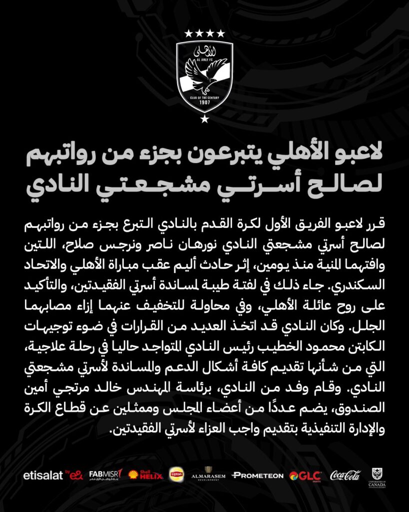 قرر لاعبو الفريق الأول بالنادي الأهلي التبرع بجزء من رواتبهم لصالح مشجعتي الفريق والذين راحوا ضحية حادث سير عقب مباراة الاتحاد السكندري الأخيرة والتي أقيمت بملعب استاد برج العرب وبتفويض من محمود الخطيب رئيس النادي المتواجد حاليا خارج البلاد في رحلة علاج قام خالد مرتجي امين الصندوق برفقه وفد يضم عدد من أعضاء المجلس ممثلين عن قطاع الكرة والإدارة التنفيذية بالنادي بتقديم العزاء لاسرتي الضحايا